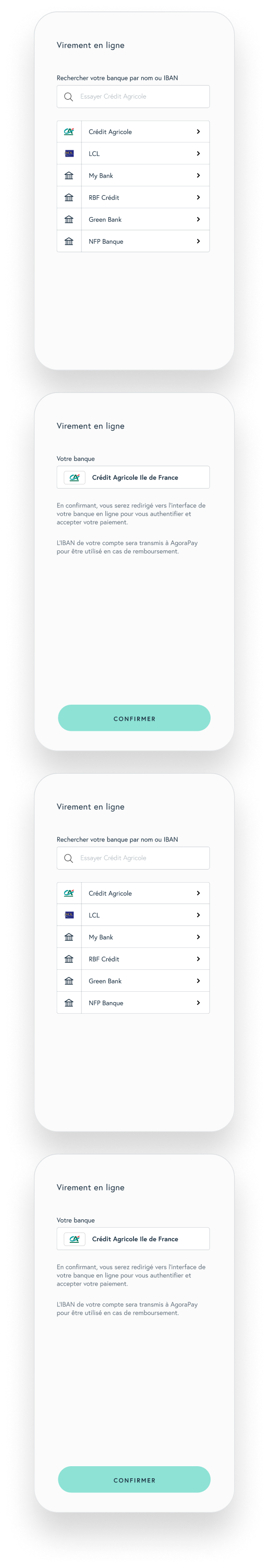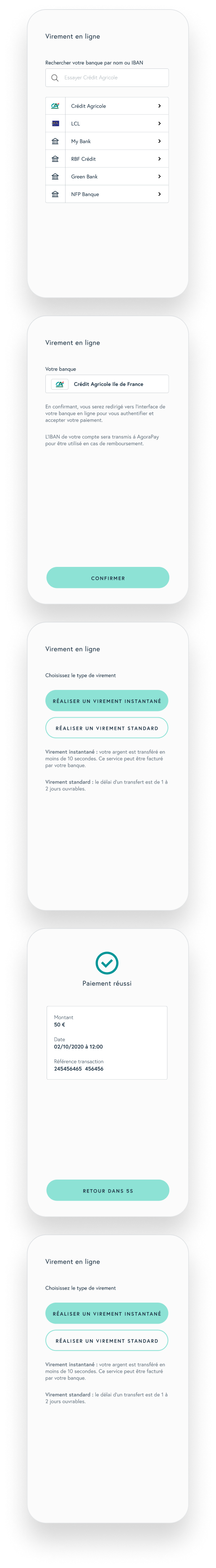 AgoraPay s’intègre aux API des établissements bancaires compatibles pour initier, à la demande de vos clients, un ordre de paiement directement depuis votre marketplace tout en réconciliant les informations depuis la commande jusqu'à l'ordre de virement (IBAN virtuel).